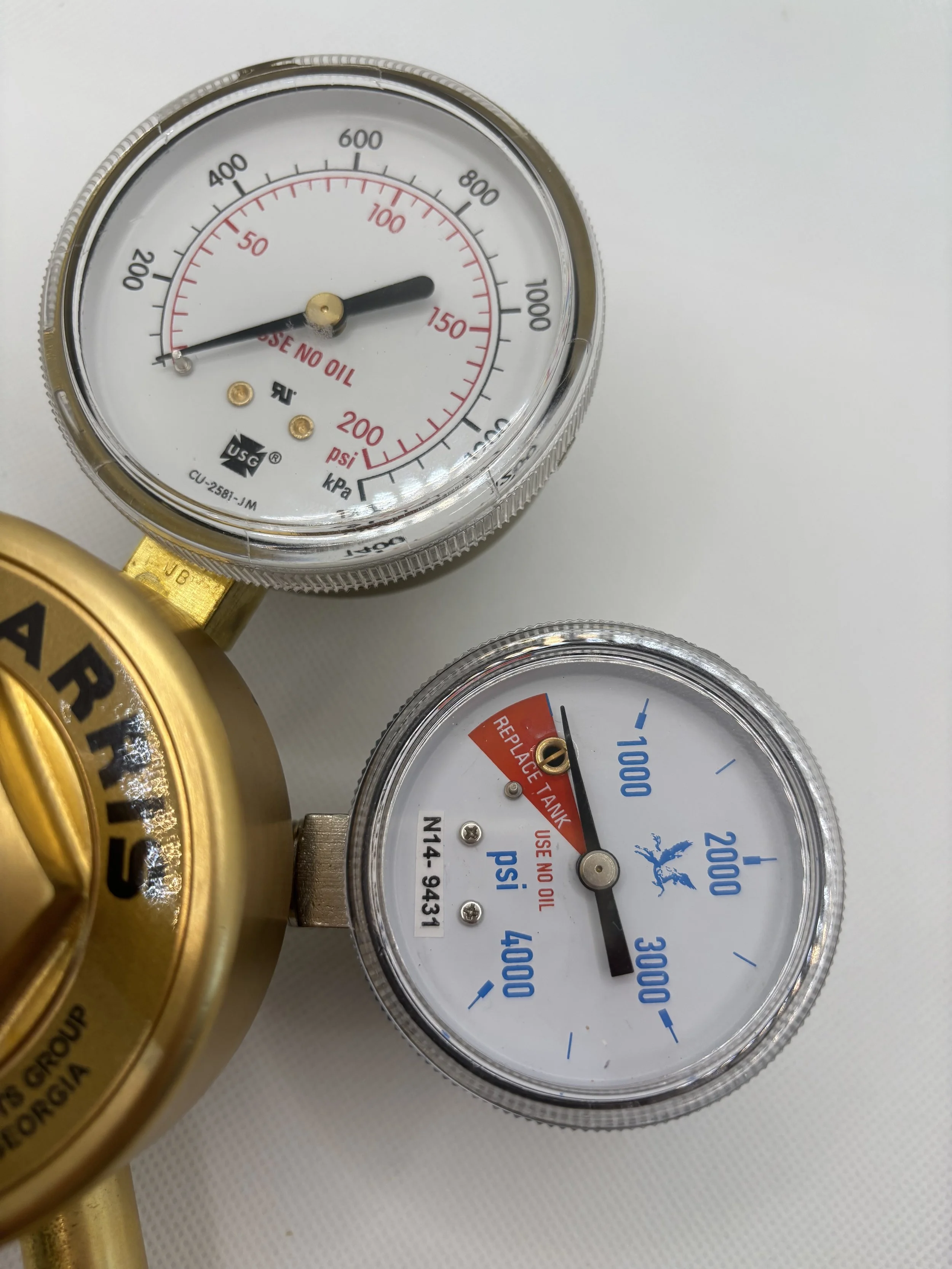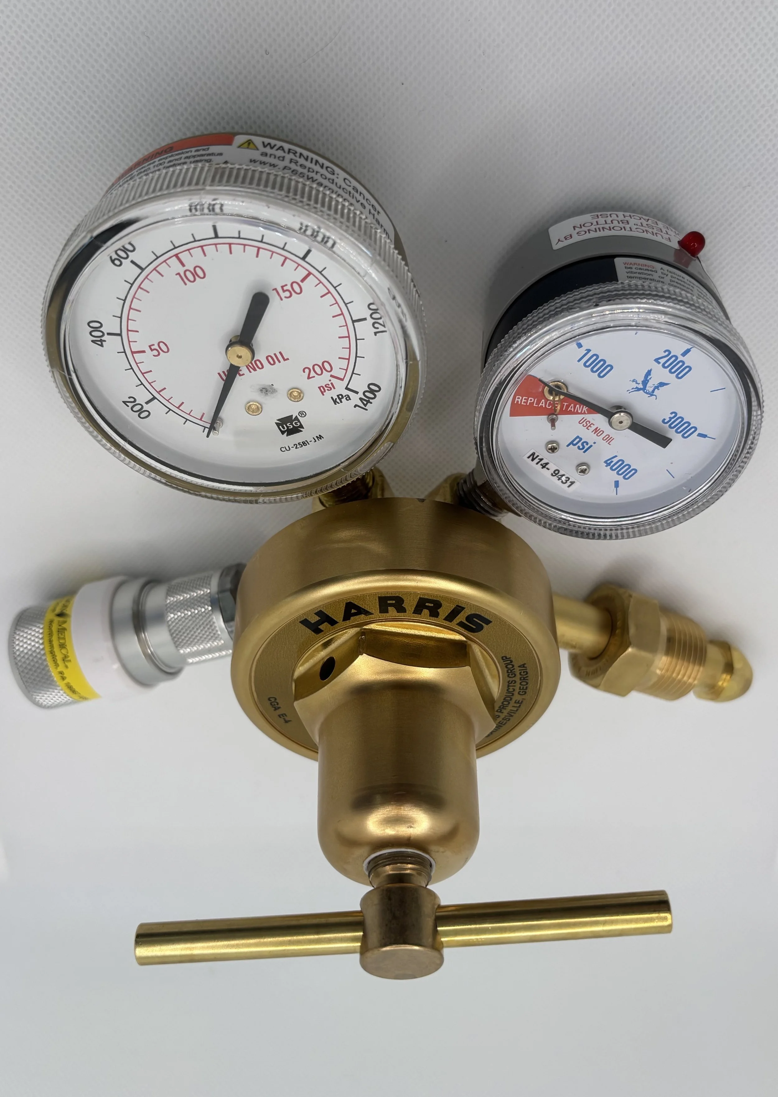 We swap out the pressure gauge on our classic Harris 425 125 580 regulator in favor of a pressure gauge that is equipped with an alarm . The alarm beeps or flashes when the tank’s PSI level dips below 500. It goes without saying that running out of air or nitrogen during a surgery is suboptimal, delaying surgeries and wasting tubing sets.